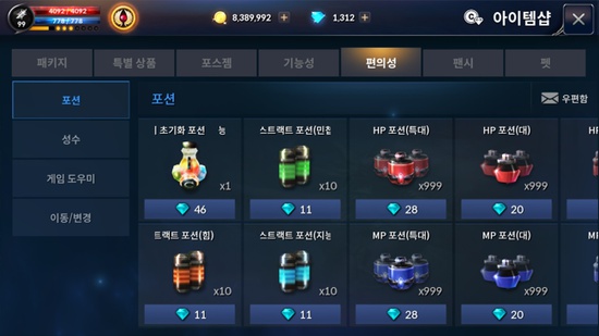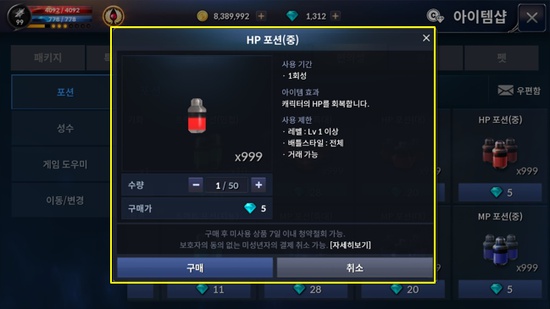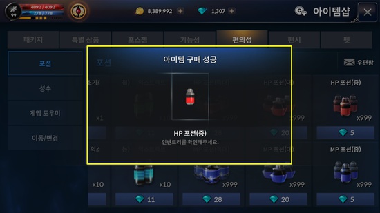 및 금액을 확인한 후 구매 버튼을 터치하면 아이템이 구매된다.
