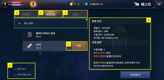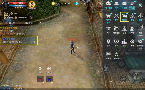 이를 통해 간략한 퀘스트 내용을 확인할 수 있으며 터치하면 해당 퀘스트 진행 위치로 이동할 수 있다.