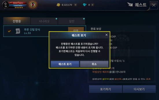 포기하기 버튼을 터치하면 퀘스트 포기 확인창이 나타나고 내용 확인 후 퀘스트 포기 버튼을 터치하면 해당