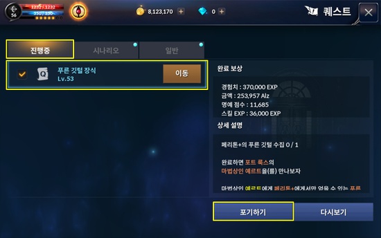퀘스트 정보창에서 진행 중인 퀘스트 리스트를 확인할 수 있는데 포기하고자 하는 퀘스트명을 터치하면 우측
