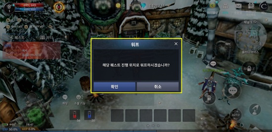요양창에서 진행할 퀘스트를 터치할 경우 워프창이 나타나 퀘스트 진행 위치로 쉽게 이동할 수 있다.