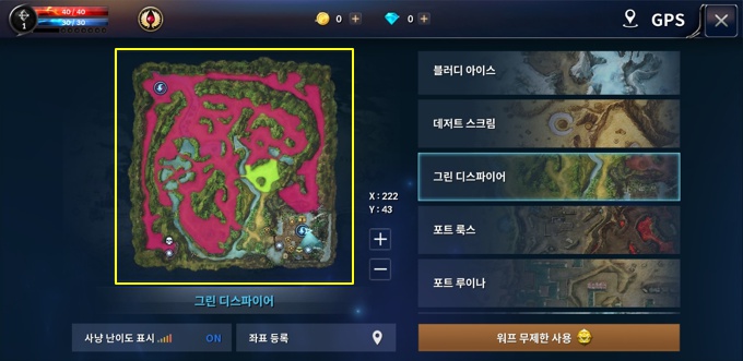 화면 우측 상단에 있는 미니맵을 터치하여 맵 전체를 확인해 볼 수 있으며, 맵 이동을 비롯하여 좌표 등록,