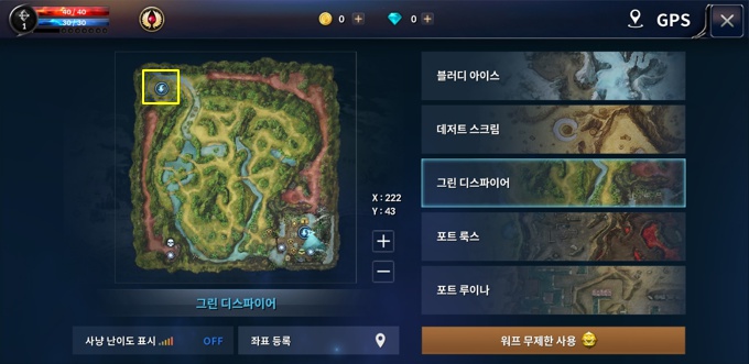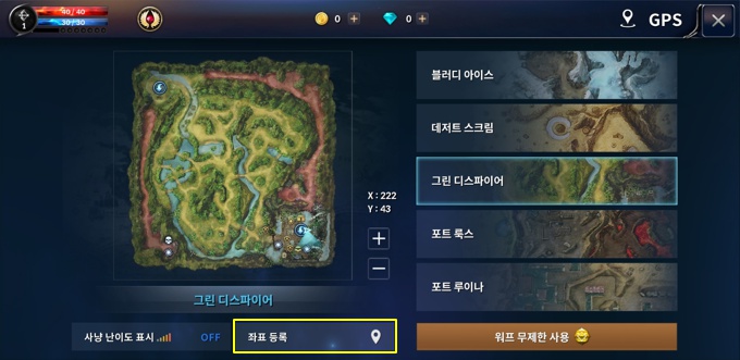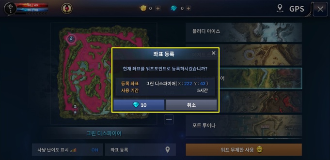 GPS 상에서 현재 캐릭터가 위치하고 있는 좌표를 포스젬을 이용하여 등록할 수 있으며 보다 편리한